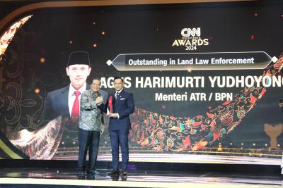 Surabaya - Menteri Agraria dan Tata Ruang/Kepala Badan Pertanahan Nasional (ATR/BPN), Agus Harimurti Yudhoyono (AHY) menerima penghargaan atas sinergi dan kolaborasi yang dilakukan dalam pemberantasan mafia tanah bersama kepolisian, kejaksaan, dan pemerintah daerah. Penghargaan _Outstanding in Land Law Enforcement_ ia terima dalam CNN Indonesia Awards 2024, Rabu (25/09/2024).